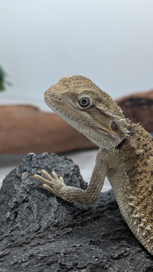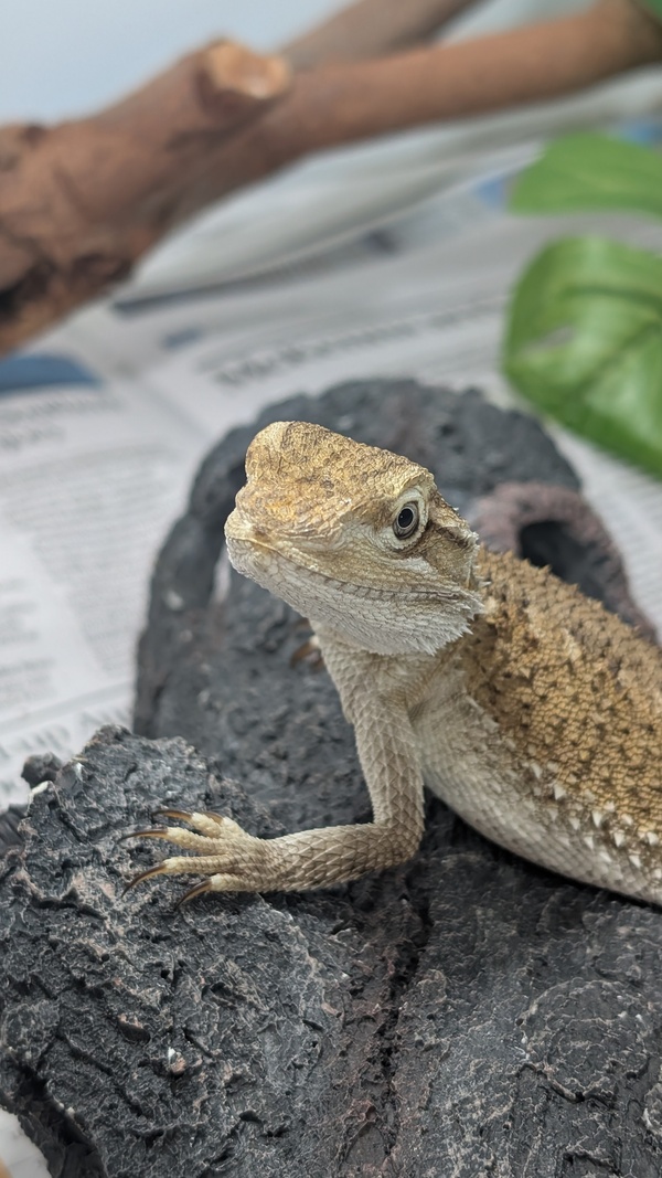 I'm an omnivorous lizard, which means I require a wide range of vegetables and insects to help me stay healthy. I love to hang out on my raised log to bask on. I also require a UV light, heat lamp, water bowl and a hide if I need a getaway.