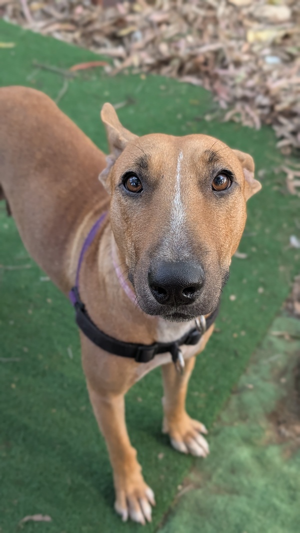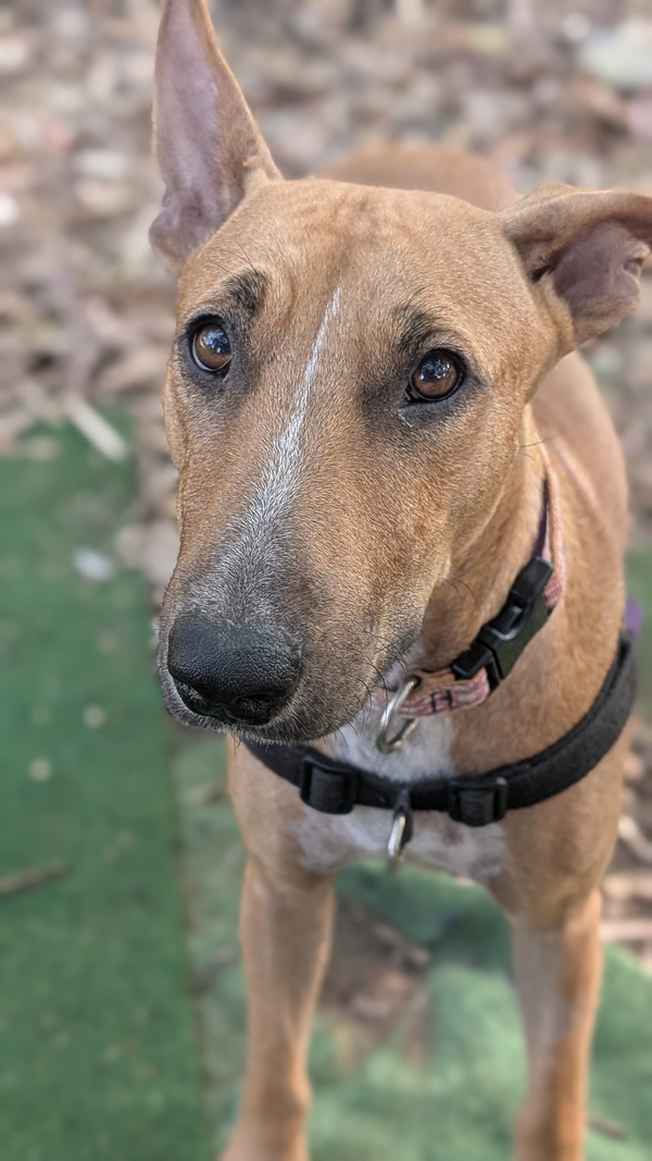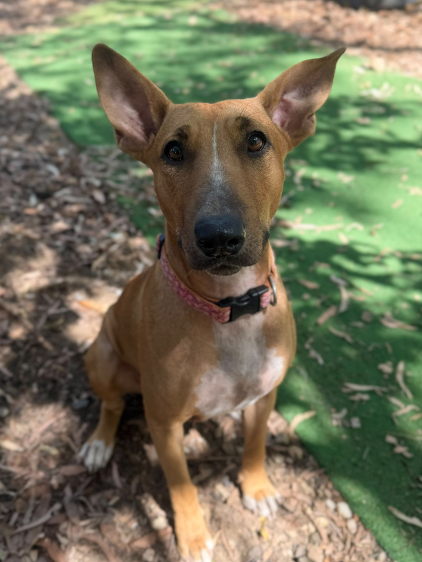 Hey there! My name is Sissy! I was brought into care with my 4 puppies after we weren't being treated the best. I came in a bit worse for wear as I was giving everything I had to my babies. BUT I am now done with motherhood and ready for my new home! I am a bull terrier x kelpie and gosh I am the epitome of both breeds! I am stubborn as a mule and a high energy girly! I am smart and VERY food motivated so I am easy to train, when I want hehe! I can be nervous of new people at first but when you earn my trust, well! I will love you forever! I am a loyal hound and I will be yours forever if you choose me. I do want to be an only dog, I can socialise with others but prefer my space and not sharing my humans. Speaking of humans, any kids in the home need to be 10+ as I am very bouncy and still learning that I do not need to crawl into your skin for affection. I love love toys and my favourite game is tug! Will you play with me? Come to the shelter to meet me today!