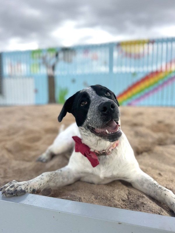 She travels well in the car and is learning fetch-she prefers the ball and is still figuring out squeaky toys. Lady enjoys sand pits, chasing toys, and yard play. She's dog-social but can be vocal and excitable when meeting new friends, so a calm, tolerant older dog would be ideal. A meet-and-greet is required at adoption. She's still working on lead manners but does better after exercise. Lady will need time to settle into her new home, so someone who's around often-or a dog friend-will help her feel secure.