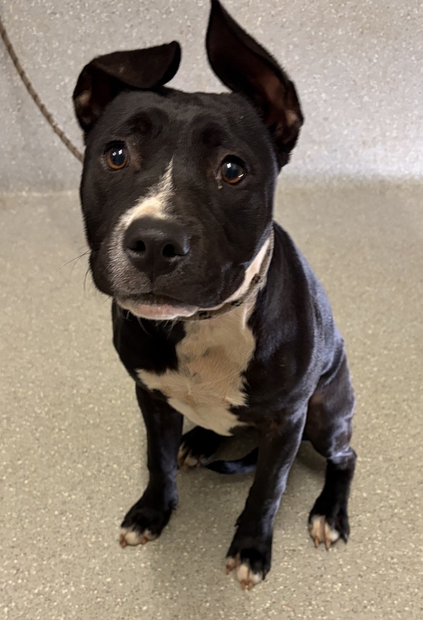 Hello! Meet Wheels, our adorable 7-month-old American Staffordshire Bull Terrier mix girl. She has a sleek black coat with charming white markings. Wheels is energetic, playful, and loves to explore, making her a great companion for active families. As a mixed breed, she may have a unique blend of traits-she's intelligent, eager to please, and quick to bond. Wheels is social, affectionate, and gets along well with other dogs. She's ready to find a loving forever home where she can thrive, learn, and share lots of fun adventures. Come meet Wheels today and see the wonderful personality behind her beautiful smile!