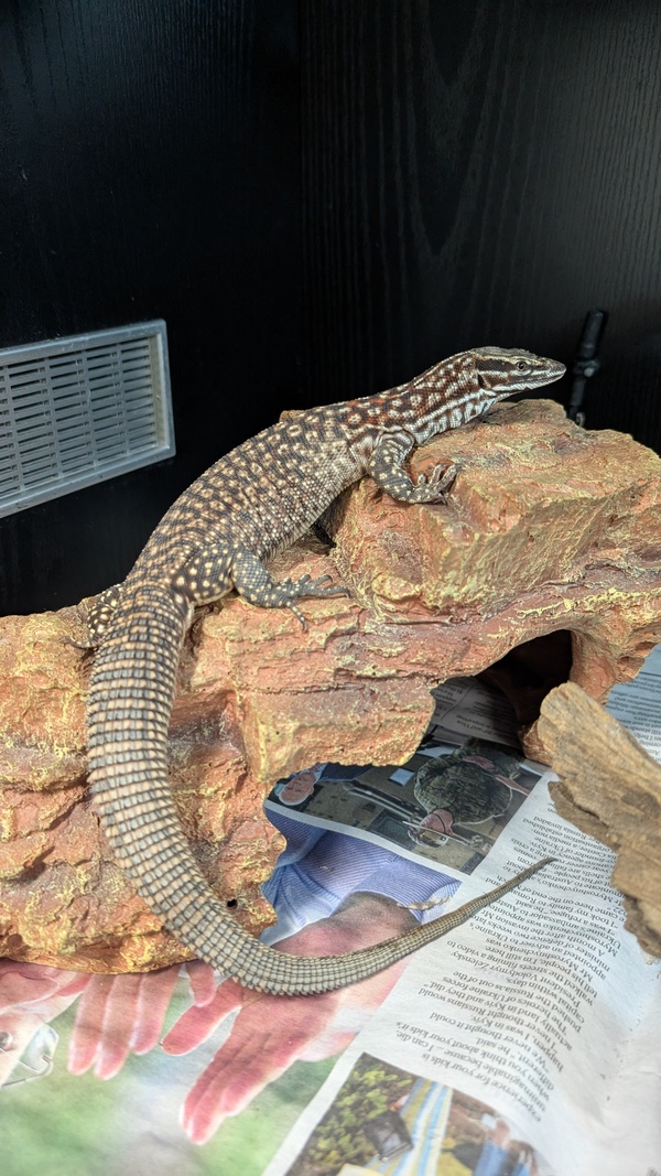 I prefer to sun bake in my enclosure and be observed rather than handled. I love climbing up on my rocks and branches, so I hope my new home has the same!