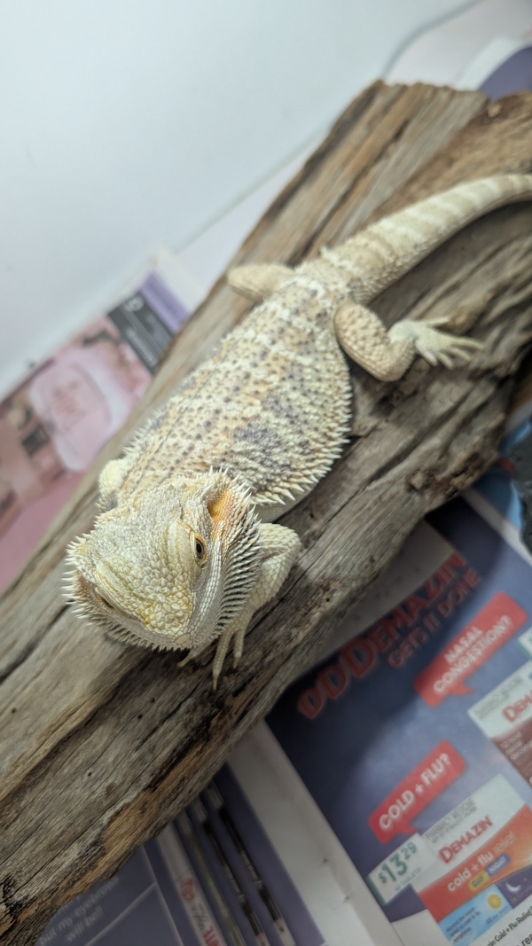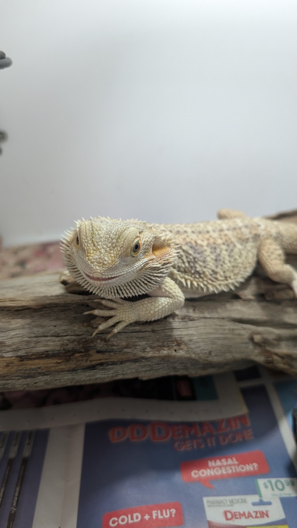 I'm an omnivorous lizard, which means I require a wide range of vegetables and insects to help me stay healthy. I love to hang out on my raised log to bask on. I also require a UV light, heat lamp, water bowl and a hide if I need a getaway.