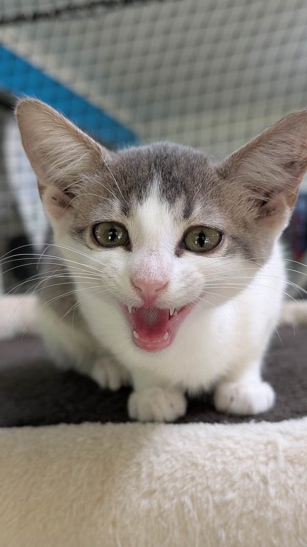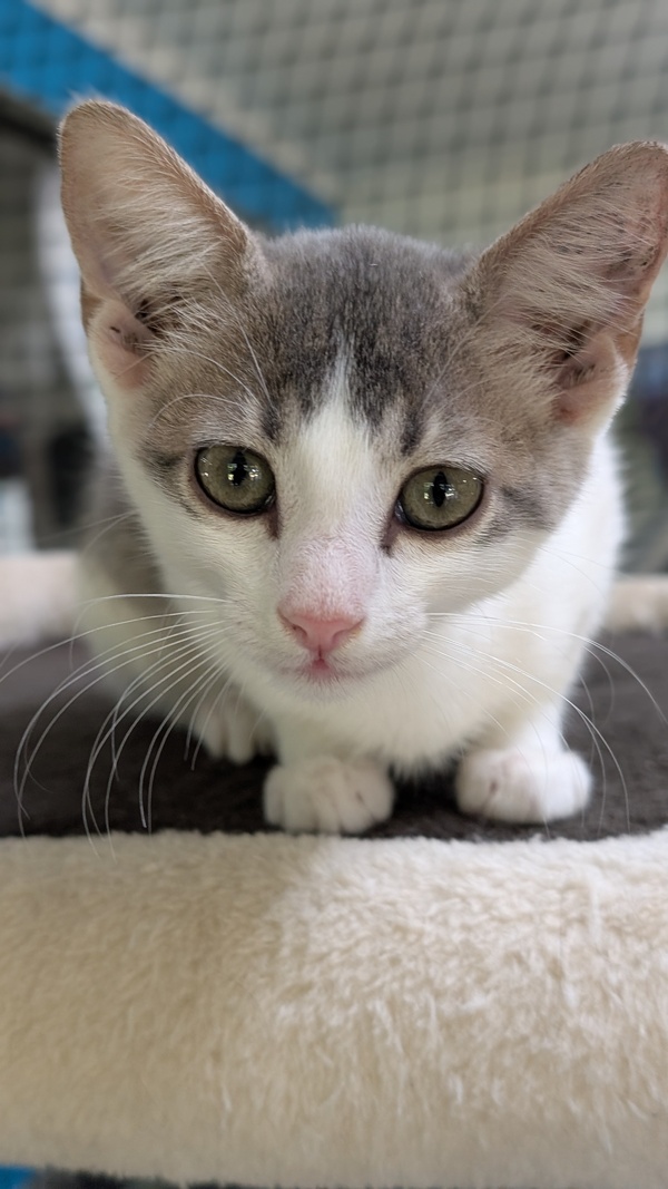I am a kitten with a fun-loving attitude and energy to burn. If you want a playful companion, then please consider me. I love to play with tinkling balls and soft toys. I am inquisitive and intelligent and like puzzles with balls that I can hit. You will often find me darting in and out of cat tunnels or climbing a cat tower. I am very friendly and enjoy the company of people. I spent time in foster care and I am good around adult cats and a small dog if given time to get to know them.