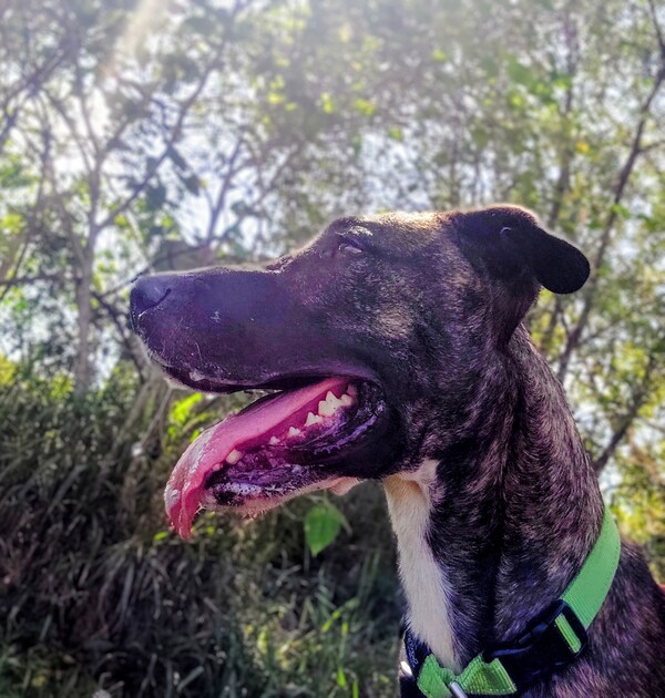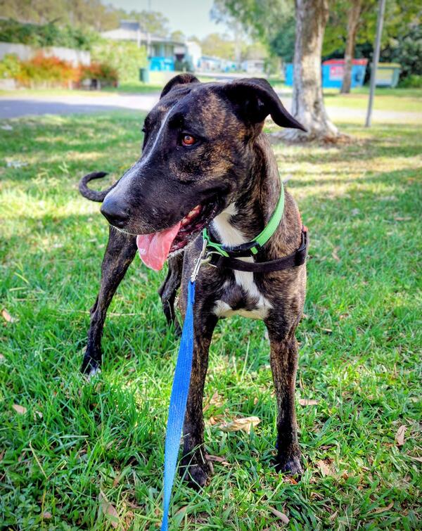 Rachel is our "larger‑than‑life" brindle girl with a heart of pure gold. Friendly, social, and wonderfully affectionate, she's the type of dog who will make herself at home in just about any loving household. Despite her impressive size, Rachel is convinced she's a lap dog-and she'll happily snuggle up with her people whenever she gets the chance.