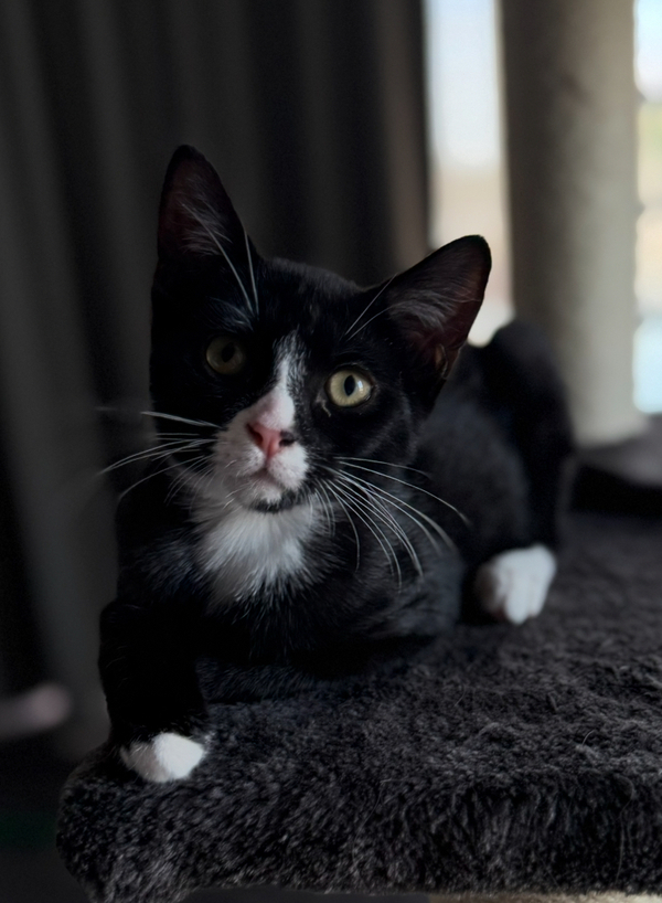 Hi, I'm Charlie! I'm a black‑and‑white kitten with a soft nature and an even softer purr. I'm a gentle little boy who loves cuddles, warm laps, and being close to my humans. I enjoy playtime and exploring, but I'm just as happy settling in for snuggles afterward.