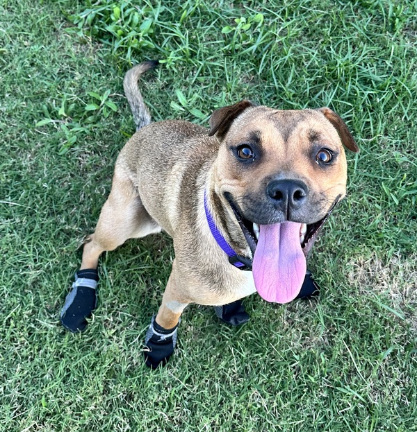 She has also been in a foster home with a cat, and has shown to be social with them even if they don't quite understand her play bows. She is open to a home with a feline friend as long as adopters are willing to allow a slow introduction.