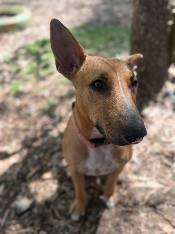 Hey there! My name is Sissy! I was brought into care with my 4 puppies after we weren't being treated the best. I came in a bit worse for wear as I was giving everything I had to my babies. BUT I am now done with motherhood and ready for my new home! I am a bull terrier x kelpie and gosh I am the epitome of both breeds! I am stubborn as a mule and a high energy girly! I am smart and VERY food motivated so I am easy to train, when I want hehe! I can be nervous of new people at first but when you earn my trust, well! I will love you forever! I am a loyal hound and I will be yours forever if you choose me. I do want to be an only dog, I can socialise with others but prefer my space and not sharing my humans. Speaking of humans, any kids in the home need to be 10+ as I am very bouncy and still learning that I do not need to crawl into your skin for affection. I love love toys and my favourite game is tug! Will you play with me? Come to the shelter to meet me today!