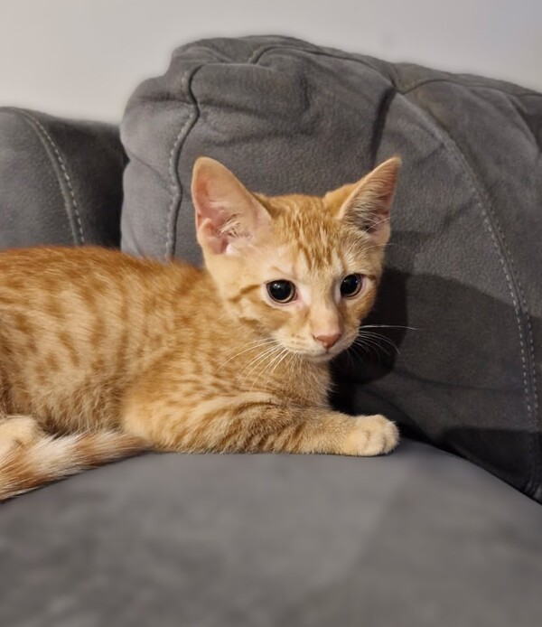 a sweet little ginger tabby boy with bright eyes, soft stripes, and a heart full of love. I'm playful, curious, and always ready for fun-whether I'm chasing toys, exploring new spots, or zooming around just to make you laugh.