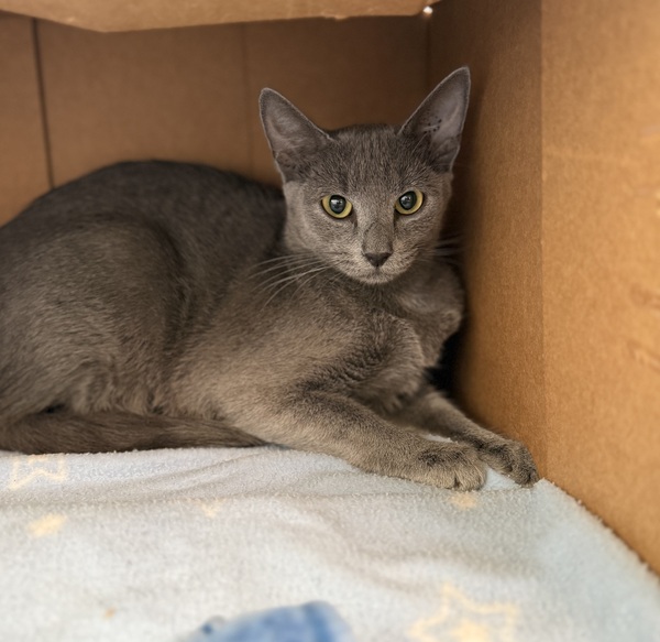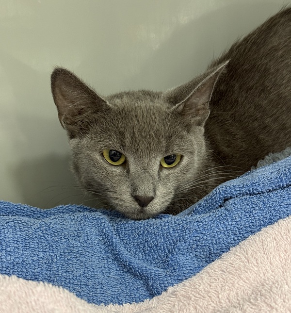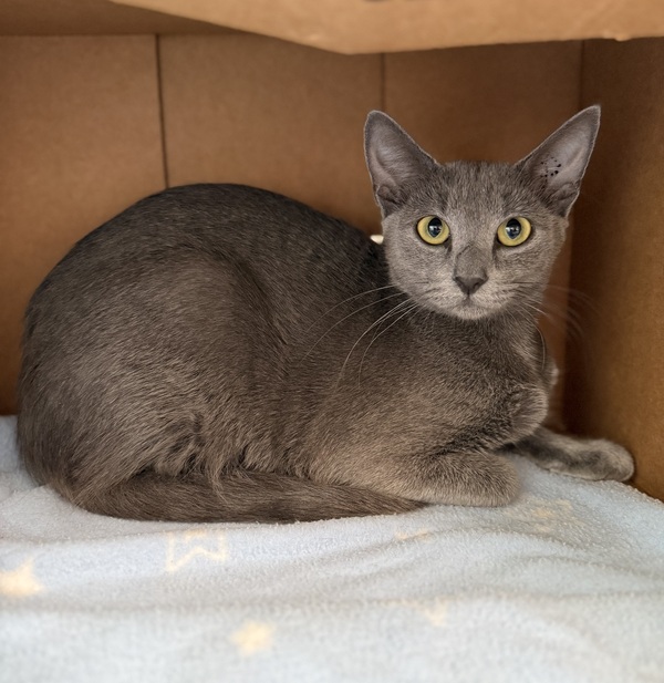 Meet Ember, a tender‑hearted, sensitive girl hoping to find a calm and loving place to call home. With her soft blue coat and easygoing nature, she brings a quiet sweetness that makes her wonderfully endearing. Ember may need a little time to settle in but with patience, a cozy launch room for the first few days, and safe hiding spots to retreat to when she feels overwhelmed, she'll blossom beautifully. She's a lovely match for respectful, older children and can join a multi‑cat household with slow, thoughtful introductions. Even first‑time adopters with a little patience will find her a gentle, rewarding companion. Ember is ready to thrive with someone who understands her sensitive, shy spirit and will cherish the calm comfort she brings, could you be that special person she is looking for?