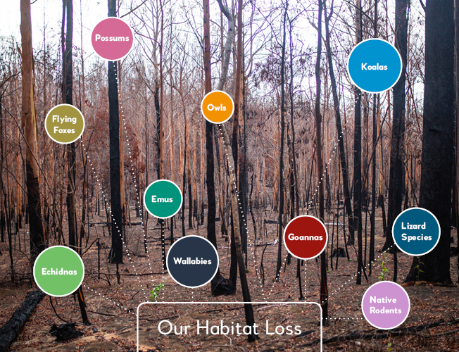 Koalas depend on certain eucalypt species for food, and on many other tree species for shelter. Sadly, isolated populations of koalas die of starvation when they are unable to access new habitat patches. View some of our koala bushfire survivors that have come through our Wildlife Hospital here.